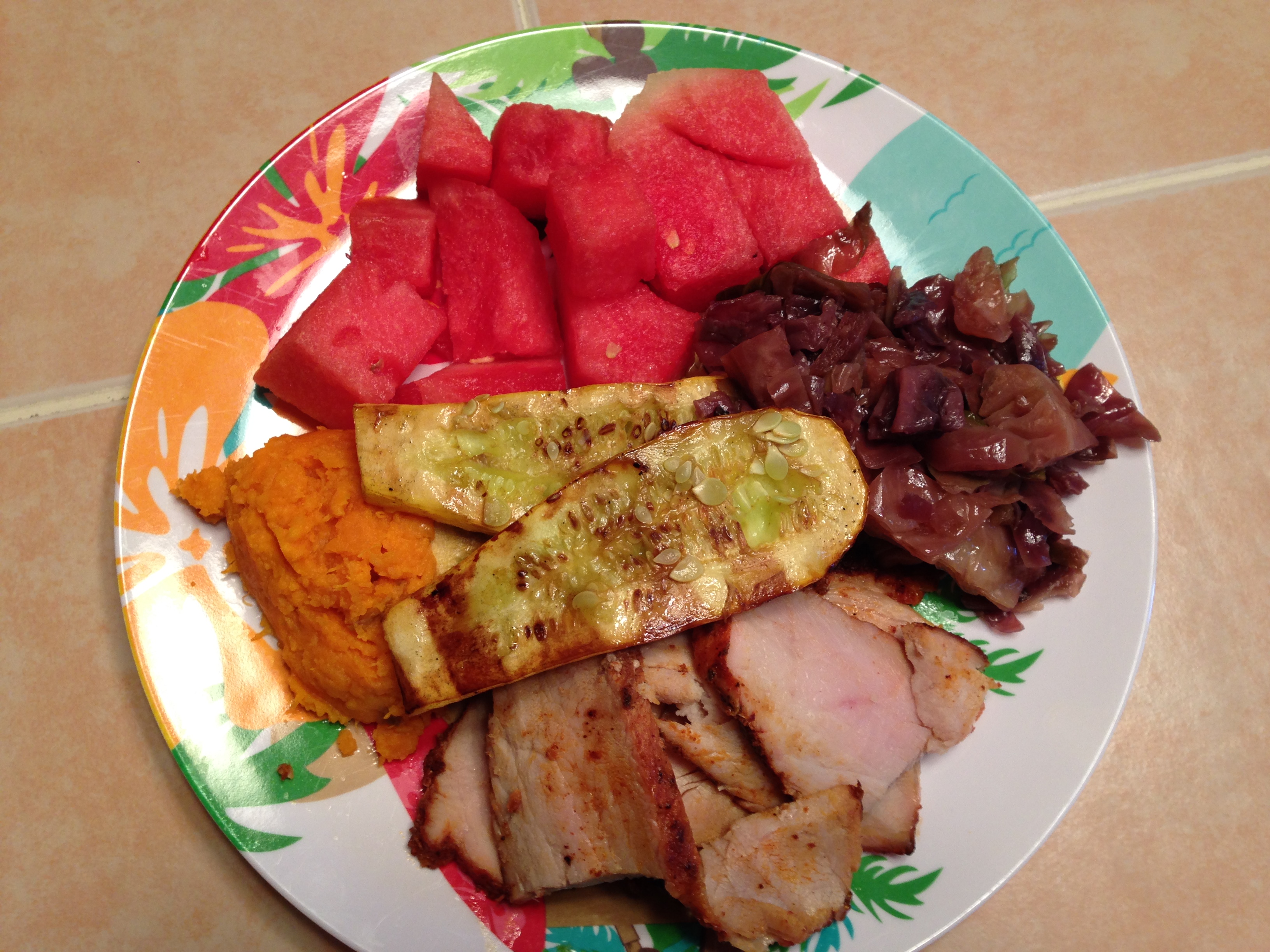 Balance out your dinner plate. Here is my delicious dinner: Grilled, marinated pork, a touch of sweet potato, watermelon, grilled squash and a side of red cabbage. Who says a Wednesday dinner needs to be boring?