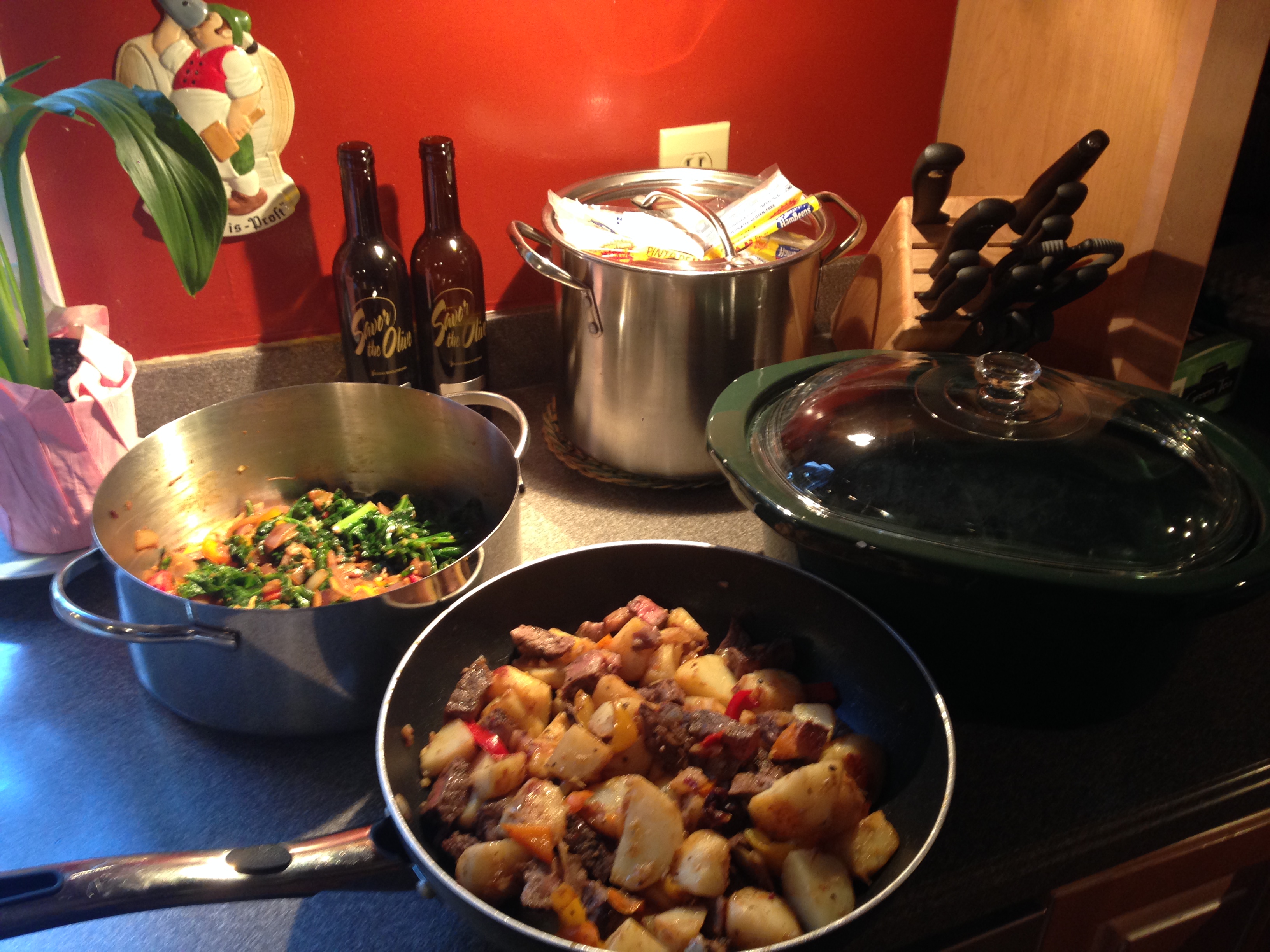 I prep a “base” of fresh veggies.  Some don’t need to be cooked in advance but they do need to be in the fridge! 😉  My root veggies I roast, I par-boil potatoes that can sit in the fridge, ready to be cut up for home fries, completed to be mashed, cut up to be scalloped, the sky’s the limit, but the prep is key to success.