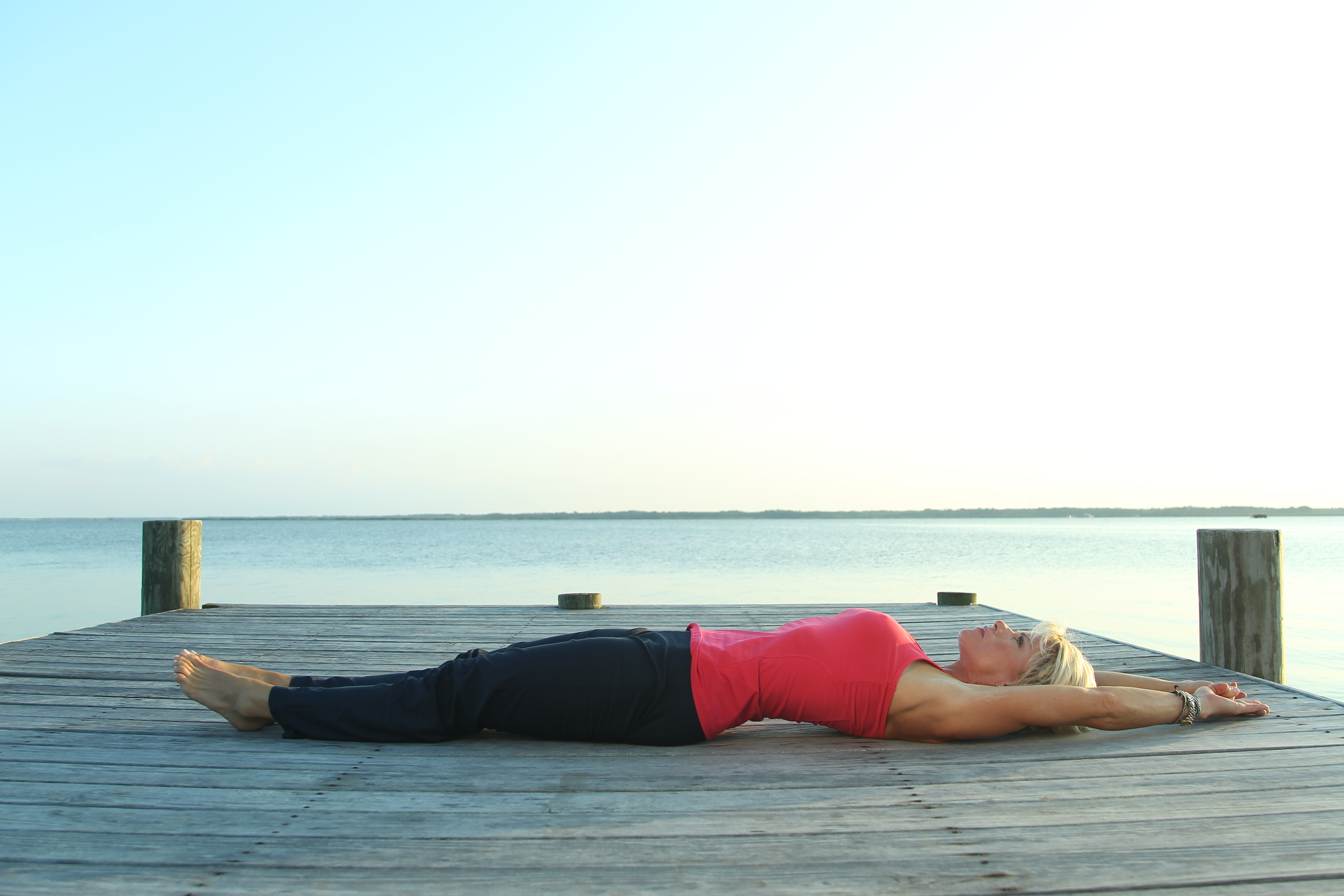 Begin by lying on your back, on the floor, knees bent, and little to no weight in your feet.  Stabilize the small of your back by bracing your lower abdominal wall and rooting your back to the mat.  Once you have stabilized, brace the upper part of the rectus abdominus, the transverse abdominus and intercostals.  This whole sequence will now be referred to as your “4 point brace”.